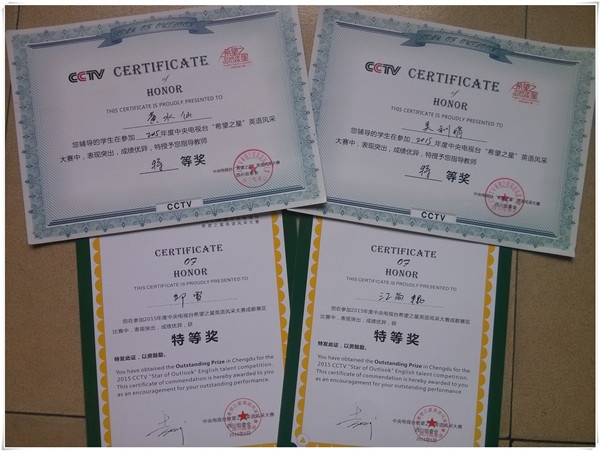 成都市三原外国语学校在2015年度中央电视台希望之星英语风采大赛成都赛区比赛中,表现突出,取得优异成绩。其中,邱雪、江尚锟同学获初中组特等奖;赵江蓉同学获一等奖;邓景珂、周阳等47名同学获二等奖;包思雨、陶欣悦等82名同学获三等奖;王秋田、李岷株、曾芷馨、董昱铭、秦韵杰获高中组一等奖;代翼、陈晨获高中组二等奖。