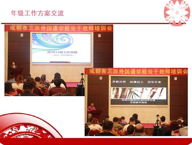 2015年8月25日—27日,成都市三原外国语学校在峨眉山七里坪温泉酒店会务中心举行了一年一度的为期三天的“骨干教师培训会”,此次培训重在解决学校下一学年的重点工作,在轻松和谐、紧张热烈的氛围中,此次培训会有序而高效,达到了预期的效果。