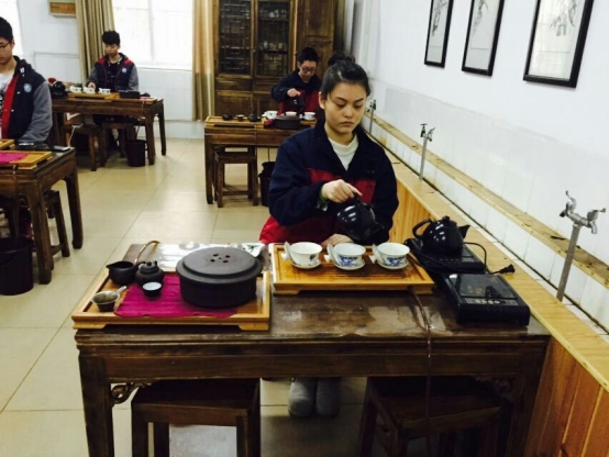 在正式泡茶之前,我们同学们都先鞠躬向茶艺祖先表示虔诚的敬意!