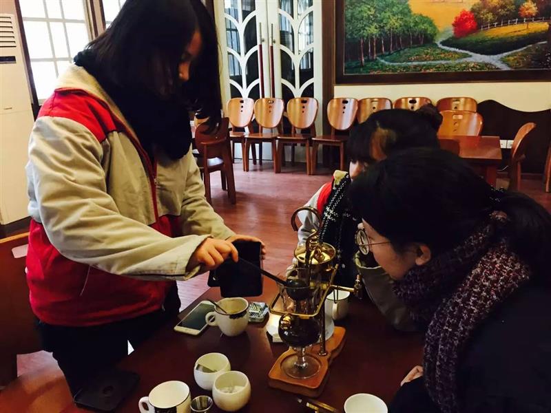 听着老师讲解怎样煮咖啡,我们的同学们也忍不住自己动手啦。(怎么样?很有感觉吧)