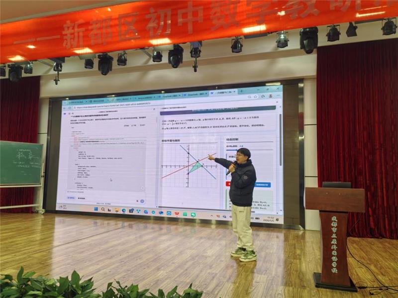 第二节课由成都市三原外国语学校的杨昊老师带来《一次函数与面积》专题课。杨老师采用“答题闯关”的教学模式,结合结算单进行过程性评价,并借助AI技术动态演示几何变化过程,有效帮助学生直观理解函数与面积的动态关系。课堂结构新颖、互动充分,学生学习投入,获得了与会教师的一致好评。