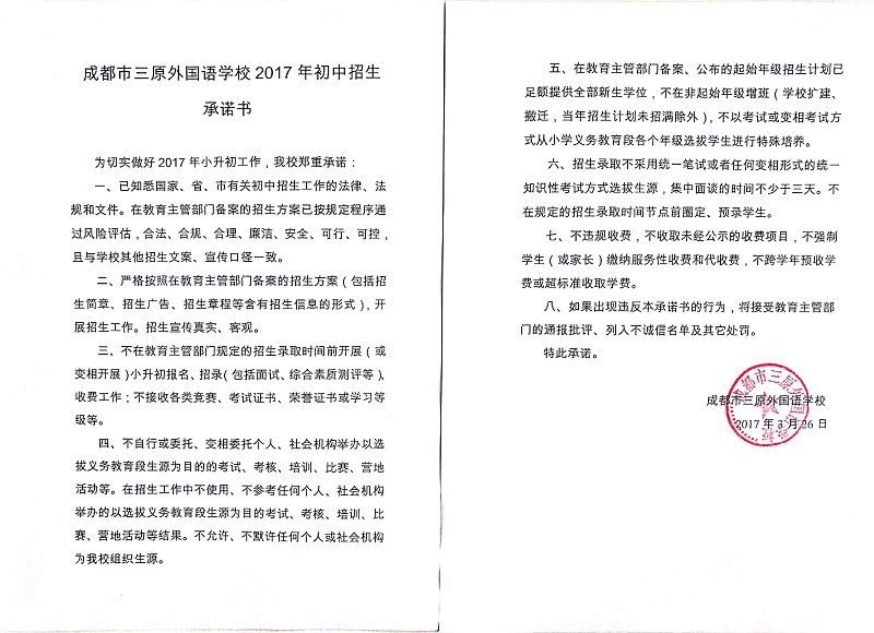 2017年初中招生承诺书