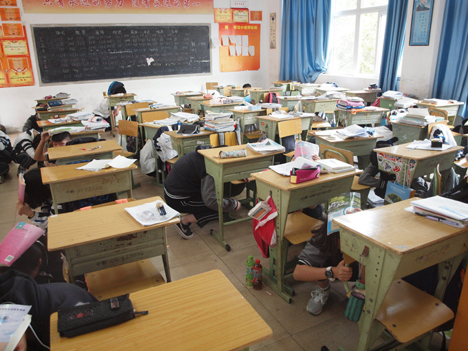 当警报声响起,老师们立即停止授课,引导学生迅速抱头蹲在课桌下,尽量降低身体重心,尽可能地保护头部。紧急哨声第二响,各班老师组织学生迅速出教室,并按照规定的疏散路线,从教学楼的不同出口有序地向操场指定位置疏散。班主任在一线组织、指挥学生安全有序地疏散,疏导组老师负责疏散引导,整个演习活动紧张有序,有条不紊。