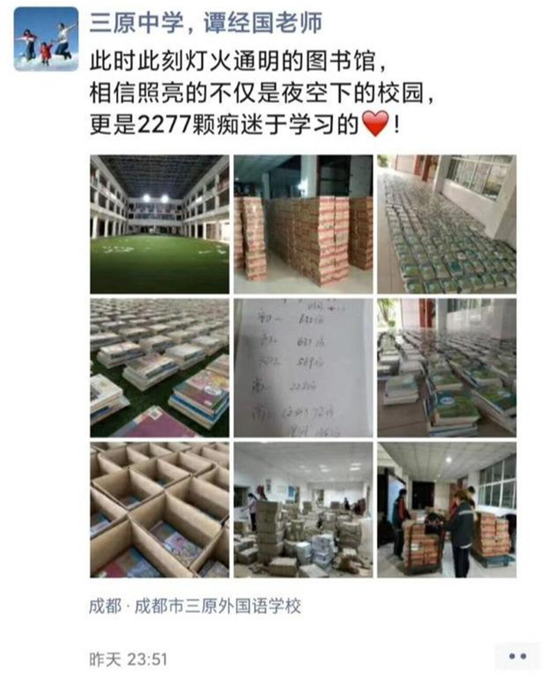 你或许见过凌晨两三点的成都,但你见过凌晨三点的校园吗?3月12日凌晨2点,成都三原外国语学校图书馆灯火通明,老师们正在将新书分捡打包好,写上学生的名字和家庭地址……