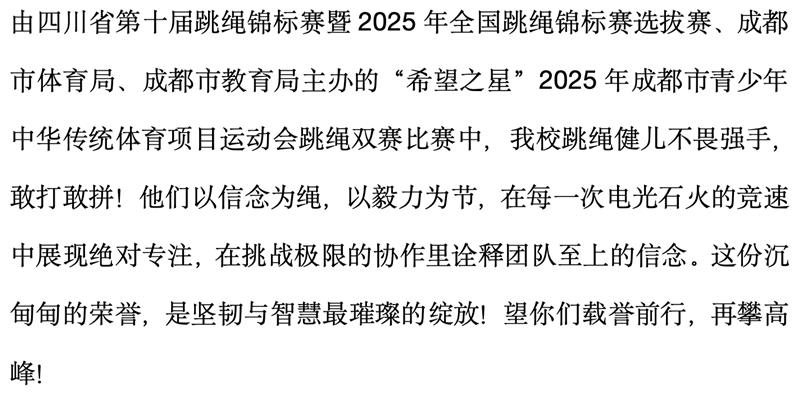 体育学科 | 四川省第十届跳绳锦标赛暨2025年全国跳绳锦标赛选拔赛、“希望之星”2025年成都市青少年中华传统体育项目运动会跳绳双赛比赛荣获佳绩
